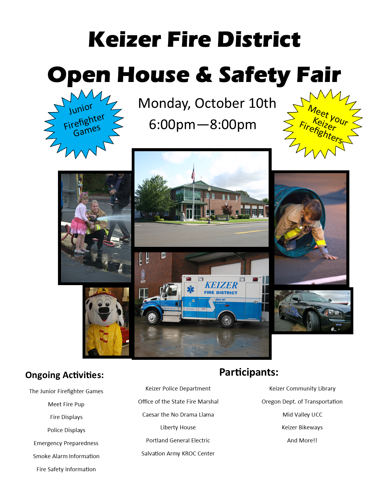 Keizer Fire District Open House & Safety Fair Oct 6, 2022 | News Join us Monday, October 10th 6pm-8pm for the Keizer Fire District Open House & Safety Fair.